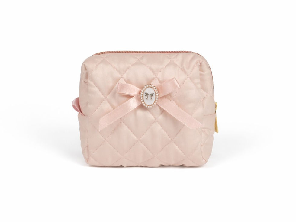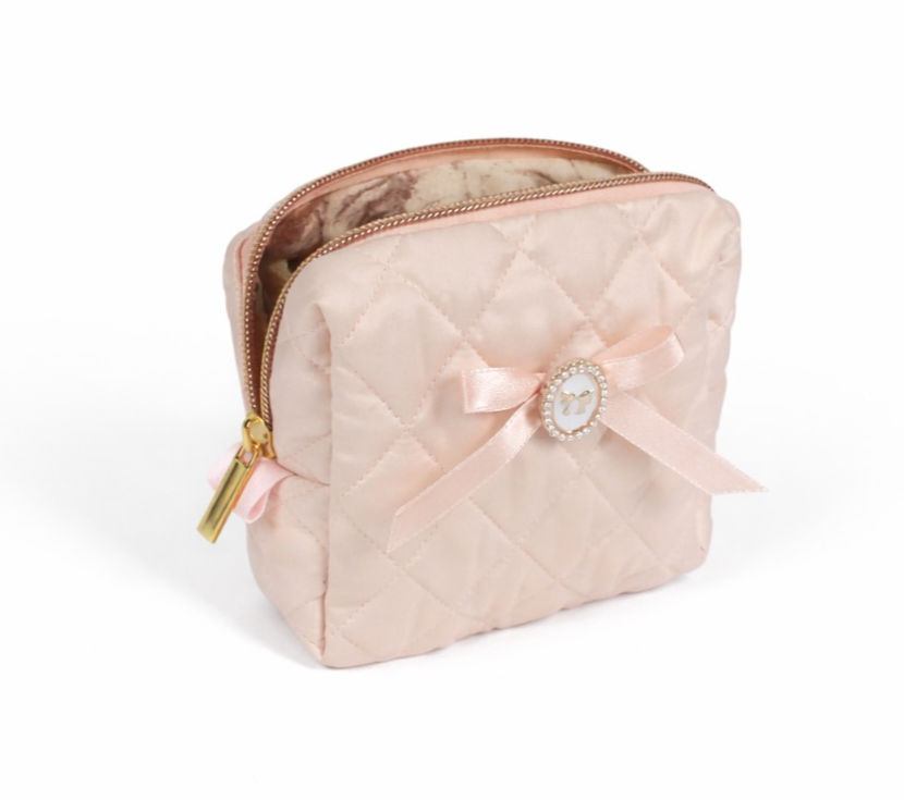 A charming quilted pouch designed for light, everyday organization. Comes in a soft nude pink shade with delicate diamond quilting, a satin bow detail, and a pearl-accent charm for an elegant finish. Compact, lightweight, and easy to carry.