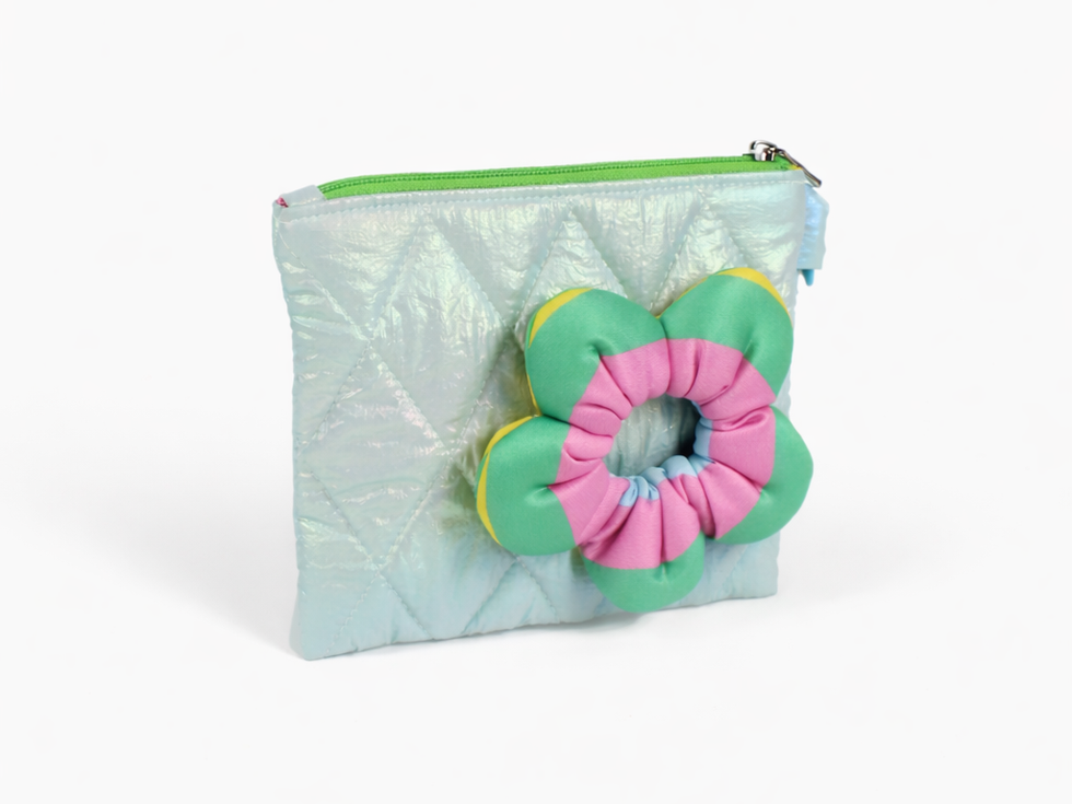 A playful puffy pouch designed for light, everyday organization. Comes in a fresh mint shade with a quilted texture and soft multi-color flower detail for a fun, standout look. Lightweight, practical, and easy to carry.