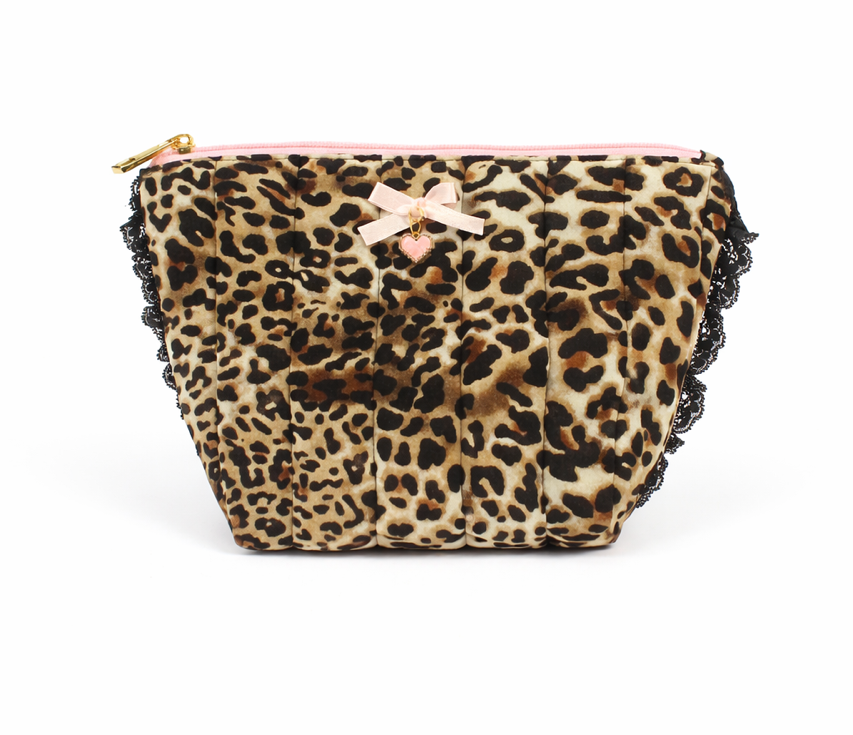 A cute pouch set designed for easy everyday organization. Features a soft quilted leopard pouch with lace trim, paired with a matching bow charm. Lightweight, roomy, and easy to carry.